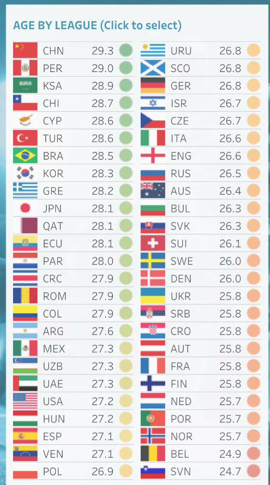 足球天文台:中超球员平均年龄全球最高,意甲平均身高登顶